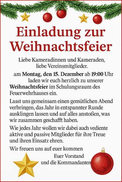 | Weihnachtsfeier | 15.12.2025 | Mo. 19:00 Uhr |