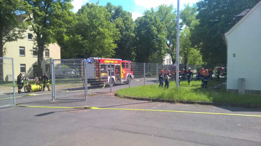 Explosionen. Es wurden zwei Angriffswege mit Verteiler und C-Schläuchen vorbereitet, mit Hilfe der Laufkarten konnten die Jugendlichen schnell den Brandraum