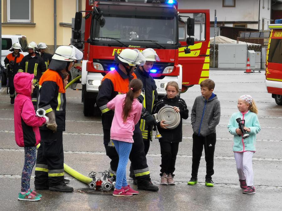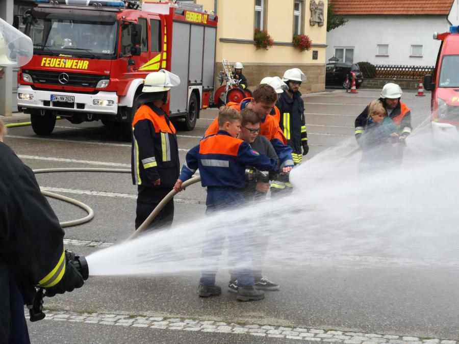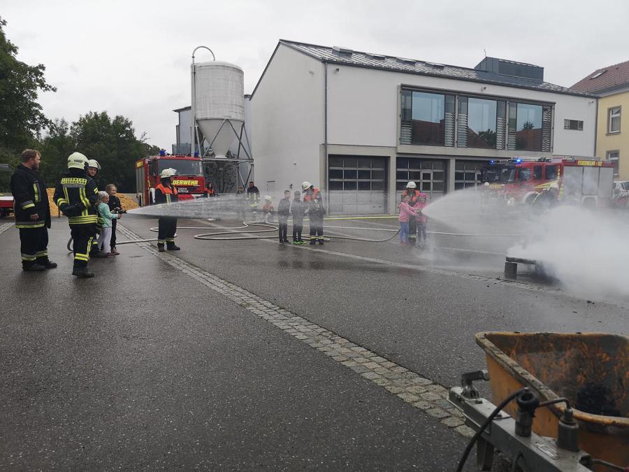 Niederwerrn bekamen die Kinder die Möglichkeit nach einer kurzen Einsatzfahrt mit Blaulicht und Martinshorn selbst Schläche auszurollen und einen Brand im Rathaushof zu